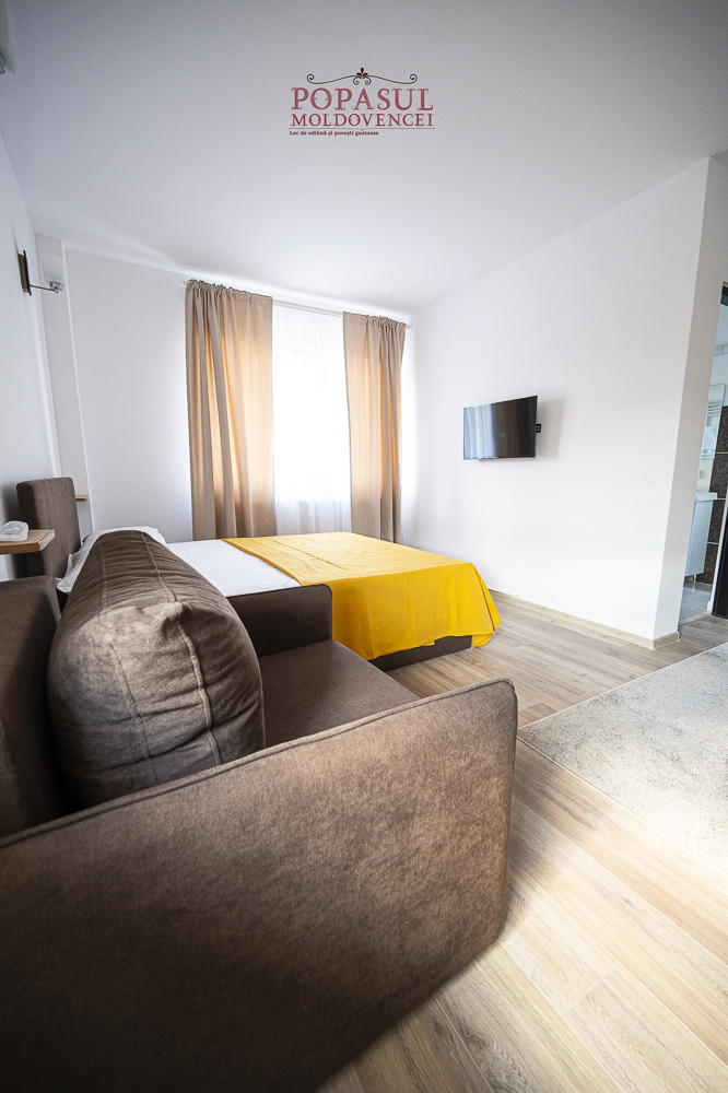 La pensiunea Popasul Moldovencei, toate camerele au dulap pentru haine, televizor cu ecran plat, baie proprie, lenjerie de pat și prosoape.